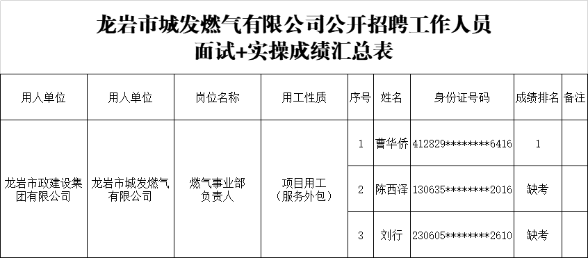 • 龍巖市政建設(shè)集團(tuán)有限公司公開(kāi)招聘工作人員面試+實(shí)操成績(jī)排名的公示