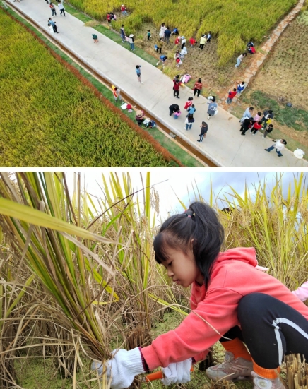 11月12日,市政集團建設的龍州濕地水稻田迎來(lái)了豐收季,藍天白云倒影在清澈見(jiàn)底的湖面,伴隨著(zhù)五彩繽紛的波斯菊花海搖曳生姿,金黃色的稻谷在秋風(fēng)中散發(fā)著(zhù)陣陣稻香...城市的繁華與美不勝收的風(fēng)景和諧共生的畫(huà)面,吸引了來(lái)自龍巖中心城區中小學(xué)生、家長(cháng)及眾多市民前來(lái)參觀(guān)、體驗。學(xué)生們利用假期走進(jìn)田間課堂,真切體會(huì )了龍巖“新晉網(wǎng)紅打卡地”的獨特魅力。