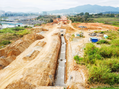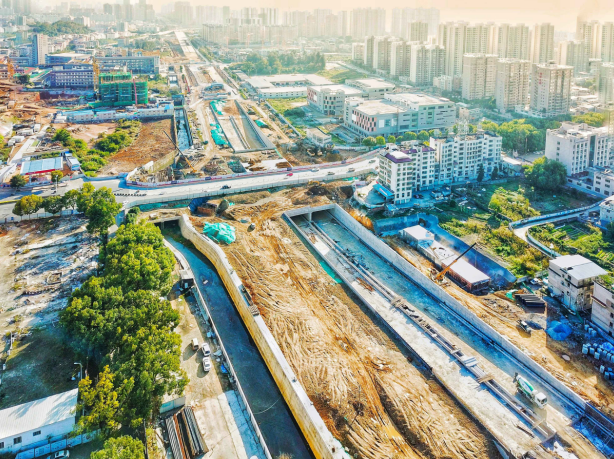 2017年9月開(kāi)工。目前,下穿車(chē)型通道U型槽、箱型通道、排洪溝主體已完成,管廊主體結構已完成45米。