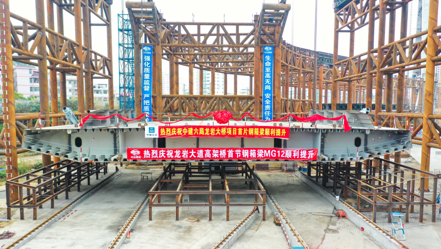 2019年12月31日上午9:28,龍巖大橋主橋首片鋼箱梁開(kāi)始吊裝,標志著(zhù)龍巖大橋主橋正式進(jìn)入鋼箱梁施工階段。首片鋼箱梁提升、滑移、頂推共歷時(shí)約8小時(shí)完成,整個(gè)主橋結構共有26片鋼箱梁。